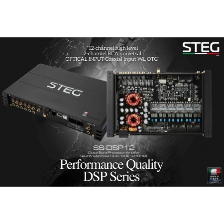 La centrale pour des intégrations OEM simples Le nouveau SS-DSP12 est un véritable multi-talent qui offre non seulement une puissance et une dynamique débridées pour un véritable son hi-fi, mais qui présente en même temps toutes les conditions préalables pour une intégration facile dans le véhicule. Connectivité transparente Avec ses six entrées de haut niveau, une entrée numérique optique est parfaitement équipée pour une adaptation transparente aux systèmes audio multicanaux existants. La plate-forme avancée de coprocesseur 32 bits est bien sûr équipée de notre plate-forme propriétaire 32 bits, qui non seulement prend en charge toutes les tâches de contrôle ultra-rapidement, mais gère également un certain nombre de fonctions audio : des effets sonores fantastiques tels que l'Augmented Bass Processing ou le Real Center sont implémentés ainsi qu'un canal séparé. Dimensions compactes Malgré son large éventail de fonctionnalités et sa puissante puissance de sortie de 12 x 80 Watts RMS sous 4 Ohms, 12x 120 Watts Max, l'UP SS-DSP12 est - comme d'habitude pour un amplificateur STEG - dans un design très compact, de sorte qu'il peut être installé sans problème même dans des espaces confinés. LOGICIEL PC TuneEQ – Des fonctionnalités puissantes pour une expérience sonore ultime Bien entendu, le STEG SS-DSP12 peut être facilement configuré via notre nouveau logiciel PC professionnel et exceptionnellement intuitif. Les nombreuses possibilités de réglage familières ne laissent rien à désirer et garantissent un réglage sonore extrêmement précis, même pour des configurations système complexes. Avec entrée OTG pour jouer directement depuis le téléphone via un câble spécial en haute résolution et Bluethoot intégré.