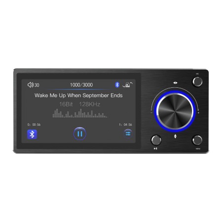 Le panneau de commande GOLDHORN avec écran est une solution élégante et performante pour les lecteurs multimédias Goldhorn compatibles DSD. Grâce à son écran IPS lumineux et à sa conception compacte, vous pouvez basculer rapidement entre les sources, les préréglages et les fichiers musicaux, sans utiliser votre smartphone ni application. Le panneau de commande offre un accès direct au volume, au niveau du caisson de basses, aux commandes de lecture et à la navigation dans les dossiers via un périphérique USB. Il se synchronise également avec l'autoradio d'origine et les commandes au volant (en option), s'intégrant ainsi parfaitement à tout intérieur. Son câble de 6 mètres permet une installation flexible dans votre véhicule, du tableau de bord à la console centrale.